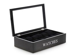 Κομψή Ξύλινη Θήκη Ωρολογιών και κοσμηματοθήκη 34x20x9cm με υφασμάτινη εσωτερική επένδυση και 12 θέσεις σε Λευκό ή Μαύρο χρώμα, Huismerk Χρώμα Μαύρο