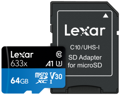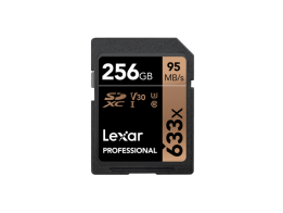256GB Lexar® Professional 633x SDHC™/SDXC™ UHS-I cards, up to 95MB/s read 45MB/s write