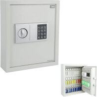 Κλειδοθήκη με ηλεκτρονική κλειδαριά 71 θέσεις κλειδιών Κατασκευή από συμπαγή χάλυβα Προγραμματισμένος κωδικός ασφαλείας 3 – 8 ψηφίων Ένδειξη LED για κατάσταση ασφαλείας και μπαταρίας Περιλαμβάνεται κλειδί παράκαμψης Τοποθετείται στον τοίχο με βίδες Ανοιγμένες τρύπες στο εσωτερικό με μπουλόνια στερέωσης Διαστάσεις: 45 x 36 x 15 cm Χρώμα: Creme
