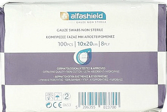 • Μη αποστειρωμένες γάζες της εταιρίας Alfashield για την περιποίηση τραυμάτων και πληγών.