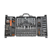Το σετ, από την εταιρία Kraft&Dele, αποτελείται από όλα όσα χρειάζονται οι λάτρεις των οικιακών DIY, καθώς και εφαρμογές. Τα εργαλεία είναι κατασκευασμένα από ανοξείδωτο ατσάλι χρωμίου-βαναδίου, διαθέτουν λαβές από ειδικό καουτσούκ σιλικόνης και συνοδεύονται από πρακτικό βαλιτσάκι αποθήκευσης και μεταφοράς. Το σετ περιλαμβάνει: 1x Ταινία μέτρησης 5m 1x Claw Hammer 16oz 22 x Hex key wrenches 4 x Κατσαβίδια ακριβείας PH 0x50/PH 1x50/SL2.4x50/SL3.0x50 mm 10 x Συνδυαστικά κλειδιά 2 x Ratchet socket handles 1/4" & 3/8" 4 x 3/8" Dr. Deep Sockerts 11/12/13/15 mm 6 x 1/4" Dr. Deep Sockerts 5/6/7/8/9/10 mm 28 x 1/4" Dr.Deep Sockets 8 x 3/8" Dr. Sockets 1 x Long Nose Plier 6" 1x Bit Driver Handle 50 mm 48 x 1/4" Bits Set  1x 3/8" Dr Spak Plug Socket 21mm 1x 3/8" Dr. Extension Bar 1x Bit Extension Bar 60mm 1x  Adaptor 3/8(F)*1/4(M) 1 βαλιτσάκι αποθήκευσης Χαρακτηριστικά: Από ανοξείδωτο ατσάλι χρωμίου-βαναδίου Λαβές από ειδικό καουτσούκ σιλικόνης Υψηλή μηχανική αντοχή και αντοχή στην τριβή Βαλιτσάκι αποθήκευσης & μεταφοράς Το προϊόν εισάγεται και διατίθεται από την SPM Network.