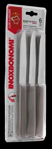 Σετ 6 μαχαιριών κρέτος κατασκευασμένα στην Ιταλία. Η λευκή περλέ χρώματος λαβή από πολυπροπυλένιο, καλουπάρετε απευθείας πάνω στην ανωξείδωτη λάμα, αποτρέπωντας έτσι το χαλάρωμα από τη χρήση. Κατάλληλα για πλυντήριο πιάτων. Ιδανικά μαχαίρια και για pizza.