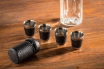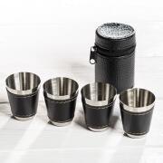 Εξαιρετικό σετ για εξωτερικούς χώρους, ταξίδια αλλά και το σπίτι. Χαρακτηριστικά : 4 σφηνοπότηρα σε δερμάτινη θήκηΤα ποτήρια είναι τυλιγμένα με τεχνητό δέρμαΚατασκευασμένα από ανοξείδωτο ατσάλιΧωρητικότητα 25 ml το καθέναΜέγεθος : 4,5 cm ύψος x 3,5 cm διάμετρος.Ωραίο πρωτότυπο δώρο για όλους