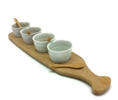 Ένα σετ από δύο πορσελάνινα μπολ σε μια ξύλινη βάση με τέσσερα πόδια από μπαμπού. Ιδανικά για σάλτσες, σνακ και ότι άλλο επιθυμείτε. Η βάση για τα μπολ έχει εσοχές για να μην κινούνται τα μπολ και να μην υπάρχει πιθανότητα να πέσουν. Τα μπολ μπορούν να πλυθούν σε πλυντήριο πιάτων. Yλικό: Πορσελάνη / Μπαμπού Χρώμα: Άσπρο / Καφέ Διαστάσεις βάσης Μήκος: 18cm Πλάτος: 10cm Ύψος: 6cm Διαστάσεις μπολ Μήκος: 9.5cm Πλάτος: 8cm Ύψος: 5cm