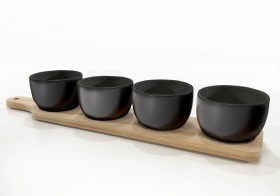 Σερβίρετε τα αγαπημένα σας σνακ ή σάλτσες με το σετ σερβιρίσματος από την Excellent Houseware. Το σετ αποτελείται από 3 μπολ ίδιου μεγέθους σε τρεις αποχρώσεις και έναν ξύλινο δίσκο. Ο δίσκος διαθέτει εσοχές για να παραμένουν σταθερά τα μπολ. Τα μπολ είναι κατασκευασμένα από κεραμικό υλικό και ο δίσκος από ξύλο μπαμπού.   Χαρακτηριστικά Υλικό: Κεραμικό, Ξύλο Bamboo Χρώμα: Ανθρακί, Κρεμ, Πράσινο, Απόχρωση ξύλου Χωρητικότητα: 156ml Tεμάχια: 4 (3 μπωλ και 1 δίσκος) Κατάλληλο για πλυντήριο πιάτων (εκτός από το δίσκο) Διαστάσεις (δίσκος) Mήκος: 40cm Πλάτος: 10cm Ύψος: 1.5cm Διαστάσεις (μπωλ) Διάμετρος: 7.5cm Ύψος: 5cm Βάρος (σετ): 709g