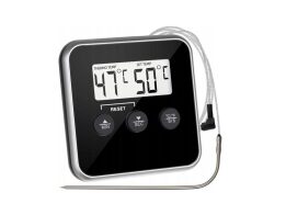 Από ανοξείδωτο ατσάλι Φωτιζόμενη οθόνη Χρονοδιακόπτης Καθορισμός του τύπου κρέατος Εύρος μέτρησης: από 0 ° C έως + 250 ° C Λειτουργεί με 4 μπαταρίες AAA (δεν περιλαμβάνονται) Διαστάσεις: 11.5 x 6 x 2 cm
