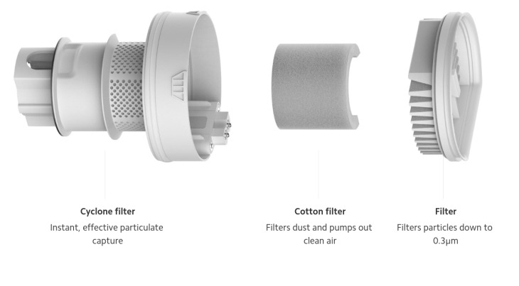 Αποδοτικό φιλτράρισμα 3 βημάτων. Το κυκλωνικό σύστημα διαχωρίζει τη σκόνη από τον αέρα. Η σκόνη συλλαμβάνεται αφού περάσει από ένα κυκλωνικό φίλτρο, ένα αποτελεσματικό φίλτρο HEPA και ένα φίλτρο από βαμβάκι, ενώ ο καθαρός αέρας βγαίνει προς τα έξω.