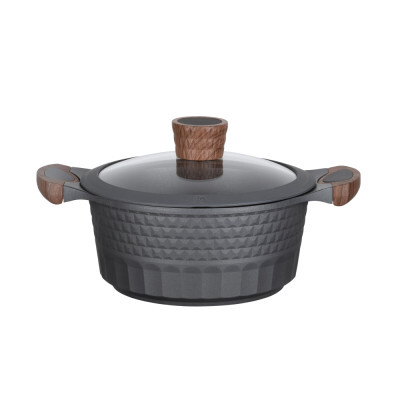 Κατσαρόλα αντικολλητική. Εσωτερική αντικολλητική επίστρωση, μοναδικός σχεδιασμός σώματος (3D εφέ), εργονομική ξύλινη μαλακή λαβή με θηλιά για να κρέμεται, γυάλινο καπάκι με έξοδο ατμού, ενισχυμένη επαγωγική βάση με δίσκο κατά της παραμόρφωσης, κατάλληλο για όλους τους τύπους κουζινών συμπεριλαμβανομένων και των επαγωγικών.