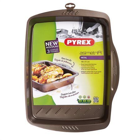 Μεταλλικό ταψί 40cm x 31cm Αsimetria, με την εγγύηση της Pyrex, που εδώ και χρόνια υπογράφει κορυφαία σκεύη για χρήση στην κουζίνα σας. Άνεση και εργονομία (εύκολο ξεφορμάρισμα με την antigrip βάση και την αντικολλητική επίστρωση, μεγάλη εργονομική λαβή για άνεση στο κράτημα, εύκολο στο καθάρισμα, με τον σχεδιασμό στρογγυλεμένων γραμμών, ιδανικό για σερβίρισμα με πρωτότυπο και μοντέρνο σχεδιασμό σε χρώμα μακαντέμια) κάνουν παιχνίδι την καθημερινή ενασχόληση με την κουζίνα, ενώ καινοτομίες και υλικά αντοχής (αντικολλητική επίστρωση χωρίς PFOA - μόλυβδο - κάδμιο για υγιεινό ψήσιμο, ομοιόμορφο ψήσιμο με το carbon steel ανθεκτικό υλικό με πάχος 0,4mm για χρήση έως 230°C) εξασφαλίζουν ότι τα σκεύη σας θα είναι σε τέλεια κατάσταση για πολλά πολλά χρόνια.