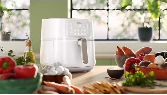 Το Airfryer 5000 Series XXL Connected της Philips χρησιμοποιεί θερμό αέρα για να μαγειρεύει τέλεια και τραγανά τα αγαπημένα σας φαγητά, με έως και 90% λιγότερα λιπαρά.