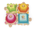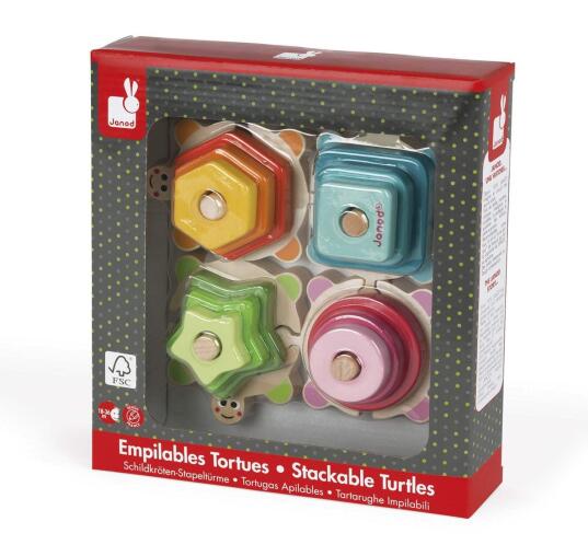 Janod Στοιβαξε Τις Χελωνες. 4 αστείες χελώνες με 12 κομμάτια που «κλειδώνουν» μεταξύ τους, για να μάθει το παιδί τα χρώματα και τα σχήματα και για να το βοηθήσουν να αναπτύξει τον συντονισμό χεριών-ματιών. Οι 4 χελώνες μπορούν να αποσπαστούν ή να ενωθούν εύκολα μεταξύ τους.