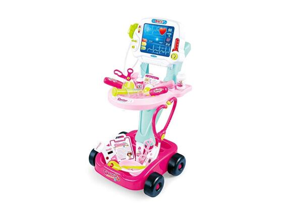 Παιδικό σετ ιατρικό τρόλει με 18 τεμαχίων σε ροζ χρώμα Medical Trolley Set Ιατρικό τρόλεϊ για κάθε παιδί που θέλει να παίξει με ιατρικά εργαλεία. Το σετ αποτελείται από 18 τεμάχια, τα οποία τοποθετήθηκαν σε ένα εύχρηστο και ελαφρύ τρόλεϊ με 4 τροχούς. Ο αριθμός των εξαρτημάτων επιτρέπει την πρακτική χρήση του σετ. Τα ιατρικά εξαρτήματα και το φορείο των 2 επιπέδων με οθόνη ECG απομίμησης και λαβή επιτρέπουν ποικίλη και επαναλαμβανόμενη διασκέδαση. Η οθόνη παρακολούθησης έχει διάφορα κουμπιά που εκπέμπουν ήχους όπως μια πραγματική συσκευή κατά τη διάρκεια μιας λειτουργίας, π.χ. έναν παλμό. Το στηθοσκόπιο κάνει ένα χτύπο της καρδιάς όταν πιέζεται και η λάμπα σε σχήμα καρδιάς φωτίζεται. Το θερμόμετρο και ο μετρητής καρδιακού ρυθμού διαθέτουν δυνατότητα να ρυθμίσετε τη μέτρηση και μια φωτεινή ένδειξη. Το ωτοσκόπιο και ο καθρέφτης έχουν φωτισμό. Το μικρό σετ γιατρών είναι ένα μεγάλο παιχνίδι που είναι επίσης μια μορφή μάθησης και σίγουρα θα ικανοποιήσει κάθε μικρό παιδί. Το σετ περιλαμβάνει: στηθοσκόπιο Ωτορινολαγνητικό ωροσκόπιο Πιεσόμετρο θερμόμετρο οδοντικό καθρέφτη νευρολογικός γόβος σύριγγα ψαλίδι πένσα ψαλίδι οφθαλμικές σταγόνες σαπούνι σε ένα σωλήνα λεκάνη χειρουργικό νυστέρι γυαλιά χωρίς φακούς μπουκάλι pin αναγνωριστικό πλαστικό σημειωματάριο σταγόνα Διαστάσεις Μήκος: 32,5 εκατοστά Πλάτος: 29 εκατοστά Ύψος: 60 εκατοστά Χαρακτηριστικά Χρώμα: πολύχρωμο Υλικό: πλαστικό Ηλικία: από 3 χρονών Πιστοποιητικά: CE, EN71 Αναφορικά με την τροφοδοσία: θερμόμετρο, ωτοσκόπιο, οθόνη καρδιακού ρυθμού και οδοντιατρικός καθρέπτης 2 x συστοιχία LR1130 (AG10) Στηθοσκόπιο 2 x LR44 (AG13) μπαταρία συμπεριλαμβανόμενη - δεν περιλαμβάνονται 2 μπαταρίες AA 1,5V AA
