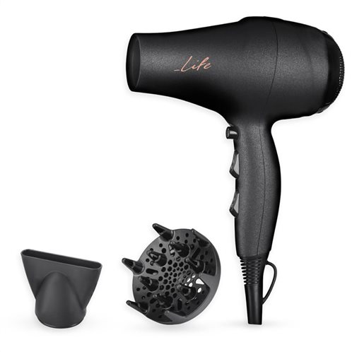 Σεσουάρ μαλλιών, 2000W. Το σεσουάρ LIFE HD-001 2000W με το κομψό design και το ιδιαίτερο ματ rubber φινίρισμα, αποτελεί ιδανική επιλογή για κάθε χρήστη. Το δυνατό μοτέρ των 2000W, δημιουργεί μία εξαιρετικά ισχυρή ροή αέρα κάνοντας το στέγνωμα και το φορμάρισμα των μαλλιών σας εύκολο και γρήγορο. Τα αποσπώμενα ακροφύσια καλύπτουν κάθε ανάγκη, καθώς περιλαμβάνονται στόμιο για ίσιωμα και φυσούνα για όγκο και μπούκλες. Η ταχύτητα και θερμότητα μπορούν να ρυθμιστούν με ευκολία για να δημιουργήσετε το επιθυμητό αποτέλεσμα. Επιλέξτε ανάμεσα στα 2 επίπεδα ταχύτητας και 3 επίπεδα θερμοκρασίας και χρησιμοποιήστε την λειτουργία cool shot για να σταθεροποιήσετε το styling μόλις ολοκληρώσετε. Τέλος, διαθέτει καλώδιο 1.8m για μέγιστη ευελιξία και είναι ιδιαίτερα ελαφρύ, 350gr, για άνετη και ξεκούραστη χρήση. - DC μοτέρ 2000W με ισχυρή ροή αέρα - Συμπεριλαμβάνονται 2 αποσπώμενα εξαρτήματα: Στόμιο 72 x 12 mm για αποτελεσματικό ίσιωμα και styling Φυσούνα για extra όγκο και ομοιόμορφες μπούκλες - 2 ταχύτητες αέρα και 3 επίπεδα θερμοκρασίας, για να επιλέξετε σύμφωνα με τις ανάγκες σας - Πλήκτρο κρύου αέρα "cool shot" που σταθεροποιεί το φορμάρισμα - Ματ rubber φινίρισμα - Αποσπώμενο φίλτρο εισαγωγής αέρα, για εύκολο καθάρισμα - Μήκος καλωδίου 1.8m - Ελαφρύ, μόλις 350gr, για άνετη χρήση - Γάντζος ανάρτησης - Τροφοδοσία: 220V-240V, 50/60Hz - Ισχύς: 2000W