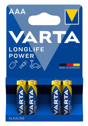 VARTA αλκαλικές μπαταρίες Longlife Power, AAA/LR03, 1.5V, 4τμχ Αλκαλικές μπαταρίες της Varta, ιδανικές για χρήση σε μικρές ηλεκτρονικές συσκευές όπως τηλεχειριστήρια, ασύρματα ποντίκια, φακούς κ.α. Οι αλκαλικές μπαταρίες της Varta προσφέρουν μεγάλη διάρκεια ζωής και κορυφαία απόδοση. Τεχνικά χαρακτηριστικά -Τύπος: Αλκαλικές -Κατηγορία: AAA/LR03 -Τάση μπαταρίας: 1.5V -Συσκευασία: 4 τεμάχια