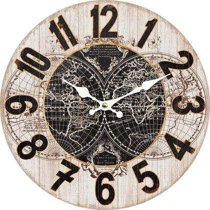 Ρολόι τοίχου στρογγυλό από MDF σε απόχρωση ξύλου με σχέδιο δύο υδρόγειους και μαύρους αριθμούς.