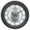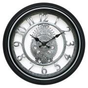Ρολόι τοίχου στρογγυλό με γρανάζια στο κέντρο του σε ασημί και μαύρες αποχρώσεις.