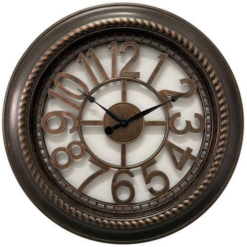 Ρολόι τοίχου στρογγυλό σε κλασικό σχέδιο με μεγάλα σκαλιστά νούμερας της ώρας σε καφέ αποχρώσεις.