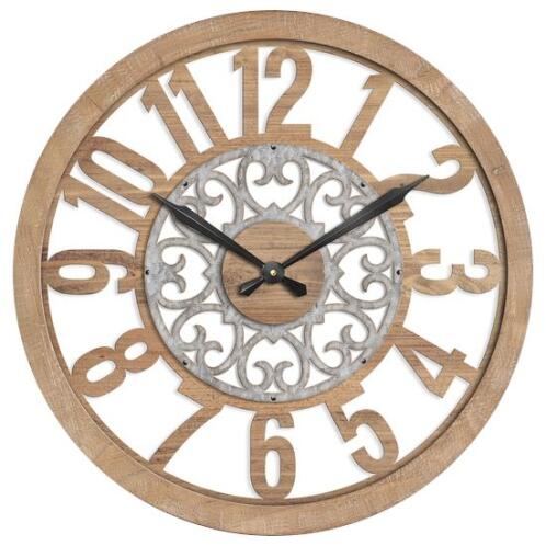 Ρολόι τοίχου στρογγυλό από ξύλο και μέταλλο με κλασικό σχέδιο σε γηίνες αποχρώσεις.