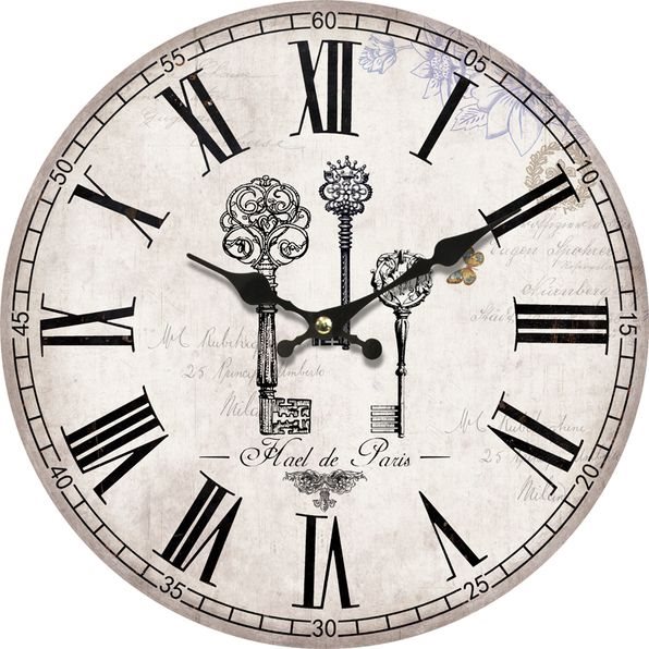 Ρολόι τοίχου στρογγυλό από MDF με λατινικά νούμερα σε γκρι απόχρωση και έχει φόντο κλειδιά.