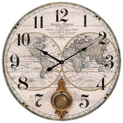 Ρολόι τοίχου στρογγυλό από MDF με διαχρονικό στυλ με σχέδιο δύο υδρόγειους και μαύρα νούμερα σε θερμές αποχρώσεις χρωμάτων.