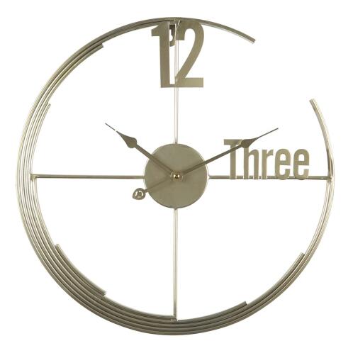 Ρολόι τοίχου στρογγυλό από μεταλλικό σκελετό σε σύγχρονο σχέδιο με χρυσούς δείκτες της ώρας.