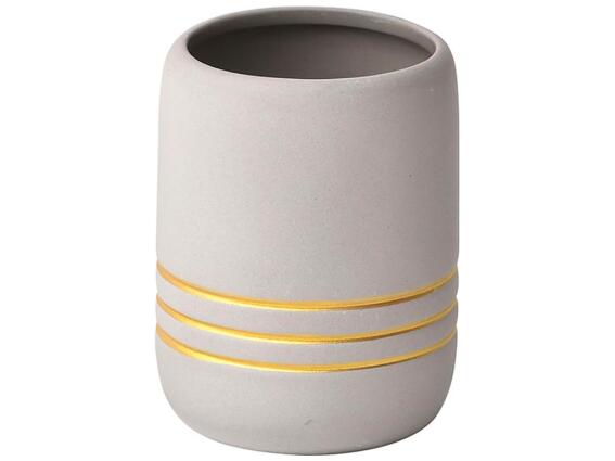 Σε γκρι χρώμα με έναν υπέροχο συνδυασμό χρυσών ριγών στο κάτω μέρος, αυτό το εξαιρετικό πήλινο δοχείο για οδοντόβουρτσες είναι κατάλληλο για κάθε μπάνιο που το διέπει μια κομψή αισθητική σε έναν φίνο συνδυασμό χρωμάτων που περιέχει και χρυσές λεπτομέρειες.