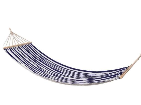 Αιώρα για τον Κήπο και το Camping σε μπλε χρώμα με σχέδιο ρίγες, 200x80 cm, Hammock blue stripes Hammock blue stripes Απολαύστε ένα απόγευμα στον ήλιο ή χαλαρώστε με ένα καλό βιβλίο στη σκιά με αυτήν την αιώρα. Είναι κατασκευασμένη από πολυεστέρα, ενώ διαθέτει σχοινιά και στις δύο πλευρές για να την κρεμάσετε. Η ανθεκτική της κατασκευή σας προσφέρει ασφάλεια και σιγουριά, ώστε να απολαύσετε ώρες ξεγνοιασιάς στον ήλιο ή την σκιά. Το ύφασμα είναι ιδιαίτερα ανθεκτικό, ενώ πλένεται εύκολα. Το υπέροχο καλοκαιρινό σχέδιό της με τα έντονα χρώματα θα σας δημιουργήσει μία ανάλαφρη χαλαρωτική αίσθηση. Χαρακτηριστικά προϊόντος: Υλικό: πολυεστέρας Διαστάσεις (επιφάνεια αιώρας): 200 x 80 cm Χρώμα: Μπλε με ρίγες Κατασκευασμένο από ανθεκτικό και ανθεκτικό ύφασμα σε λευκό και μπλε. Έχει ξύλινο σκελετό. Ιδανικό για τον κήπο. Η αιώρα θα εξασφαλίσει μια άνετη ξεκούραση. Μέγιστο φορτίο 120 kg.