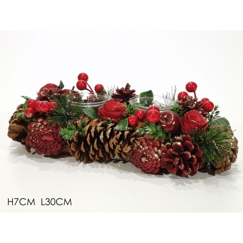 Κηροπήγιο 2 θέσεων με κουκουνάρια και berries πολύχρωμο 7x30cm.