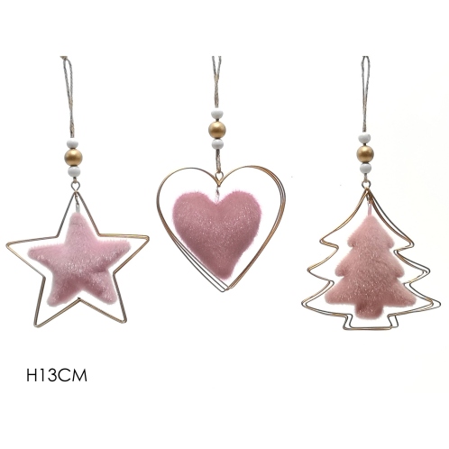 Στολίδι κρεμαστό αστέρι/καρδιά/δεντράκι με ροζ γούνα χρυσό μέταλλο 13cm σε 3 σχέδια.