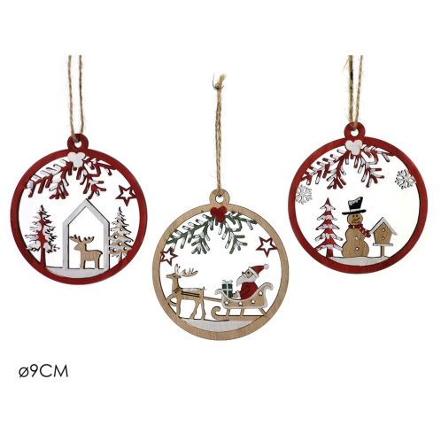 Στολίδι κρεμαστό στεφάνι με σκηνικό ξύλο Φ9cm σε 3 σχέδια.