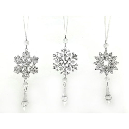 Στολίδι κρεμαστό χιονονιφάδα με ασημί glitter διάφανο γυαλί σε 3 σχέδια.