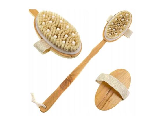 Ξύλινη βούρτσα μασάζ και μπάνιου με λαβή και ιμάντα καρπού, 12x7x43 cm Αυτή η βούρτσα χρησιμοποιείται για υγρό ή στεγνό καθάρισμα η ξύλινη λαβή είναι αφαιρούμενη και η βούρτσα είναι εξαιρετικά άνετη, κατάλληλη για πλύσιμο της πλάτης και για μασάζ κατά της κυτταρίτιδας των ποδιών και των μηρών. Βελτιώνει την κυκλοφορία του αίματος, γεγονός που κάνει το δέρμα πιο τρυφερό. Αφαιρεί την ξερή επιφάνεια της επιδερμίδας, κάνοντας το δέρμα της πλάτης λείο και απαλό. Χαρακτηριστικα προϊόντος: Υλικό: Ξύλο Χρώμα: Φυσικό χρώμα ξύλου Με λαβή Με ιμάντα καρπού Με θηλάκι για κρέμασμα Διαστάσεις: 39x6.5x4 cm Συνολικό μήκος της βούρτσας : 43 cm Διαστάσεις βούρτσας: 12 cm x 7 cm Ιδανική για μασάζ κατά της κυτταρίτιδας των ποδιών και των μηρών